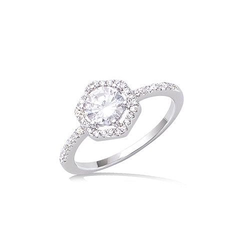 The Aurora Ring is designed to stand out. Its hexagonal shape, with a sparkling zirconia stone at its center and delicate accents surrounding it, makes this ring a stylish choice for any occasion. Perfect as a gift or a treat for yourself.