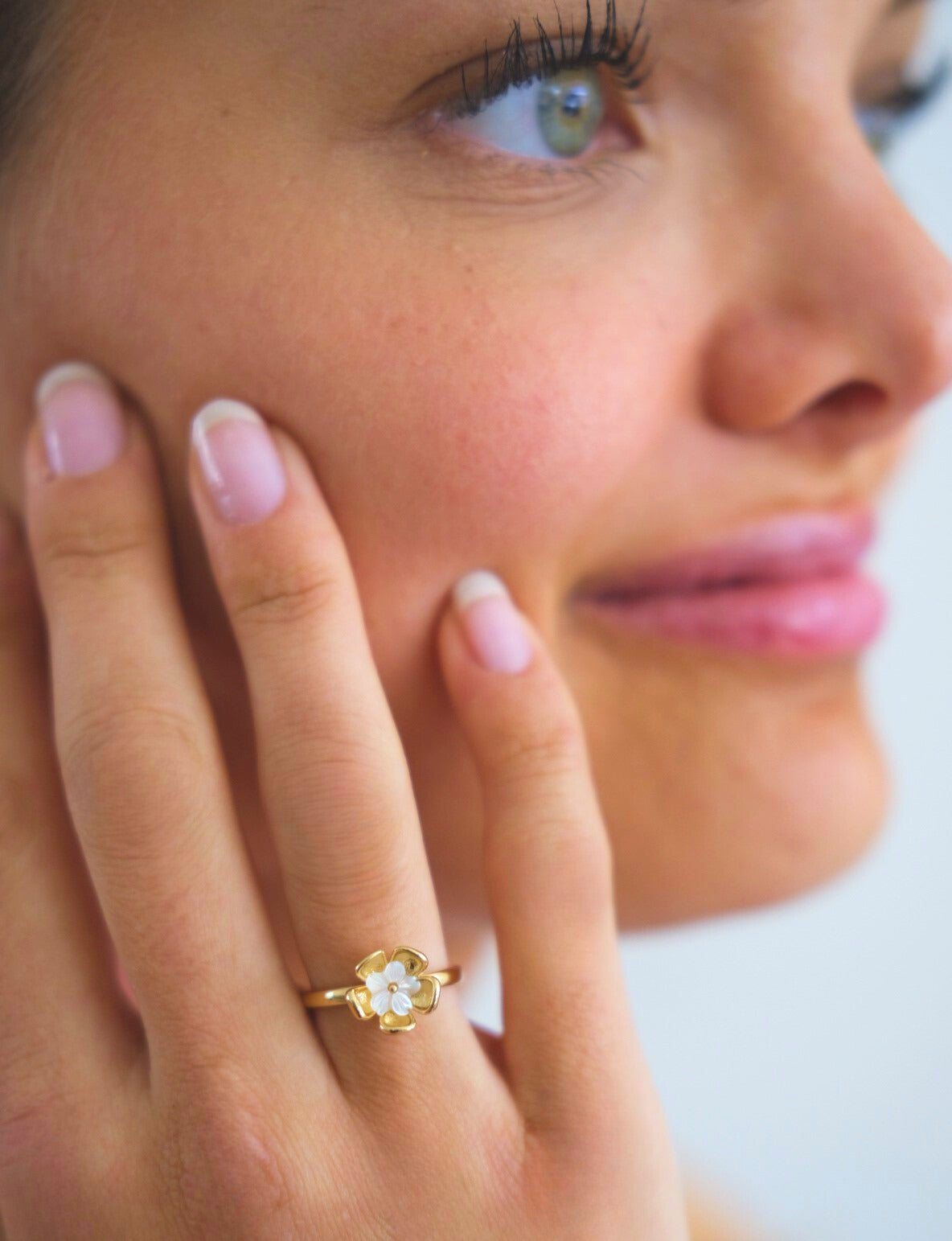 The 18K gold-plated design features an elegant flower with a smaller white flower within, giving the ring a delicate, charming look. This piece exudes pure elegance and adds a timeless, natural flair to any look. Perfect for a romantic touch in your everyday life and a perfect gift for yourself or your loved ones.