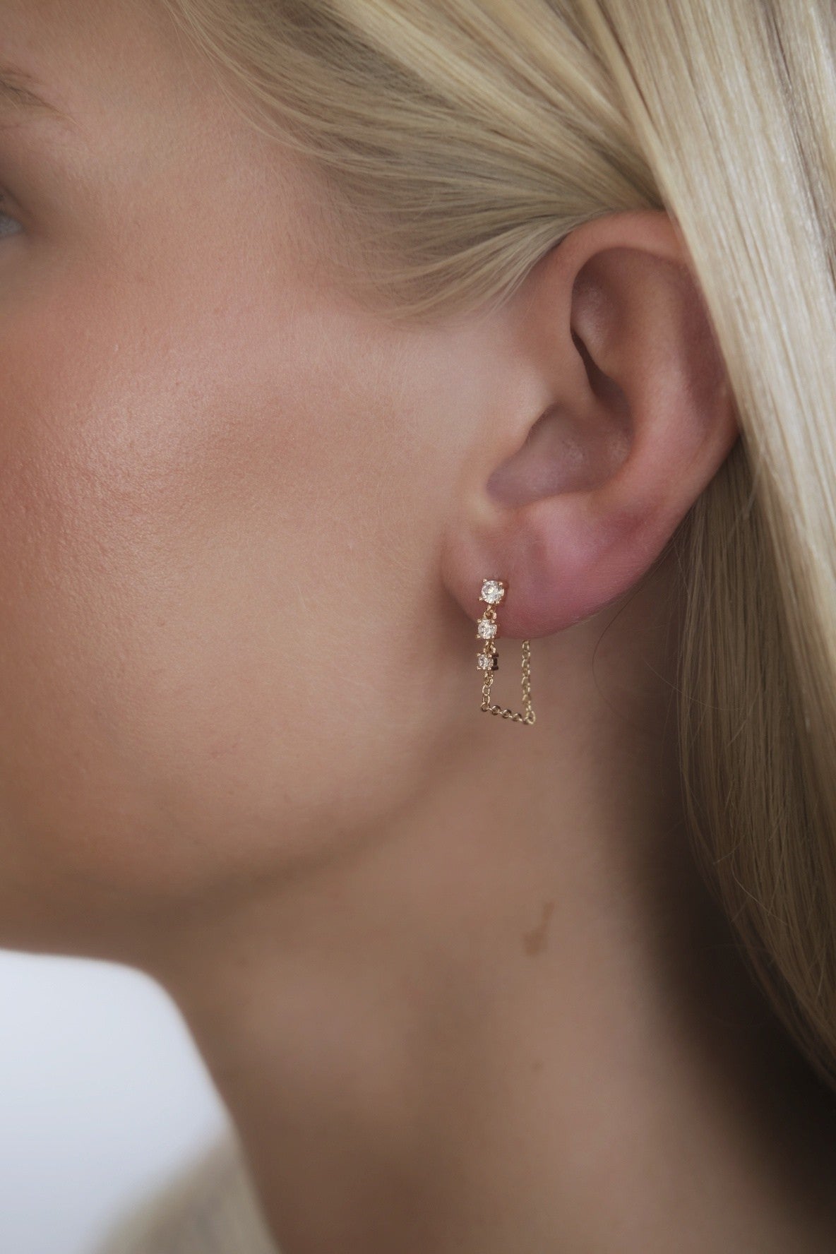 The Eclipse Drop Earrings are a statement of refinement and elegance. These dazzling earrings feature a unique design where the earring hangs down, elegantly curves back, and fastens at the back. The earring is set with sparkling cubic zirconia, creating a refined, luxurious look, while the 18K gold plating adds a warm glow. The design is both bold and refined, making these earrings the perfect choice for both everyday wear and special occasions.