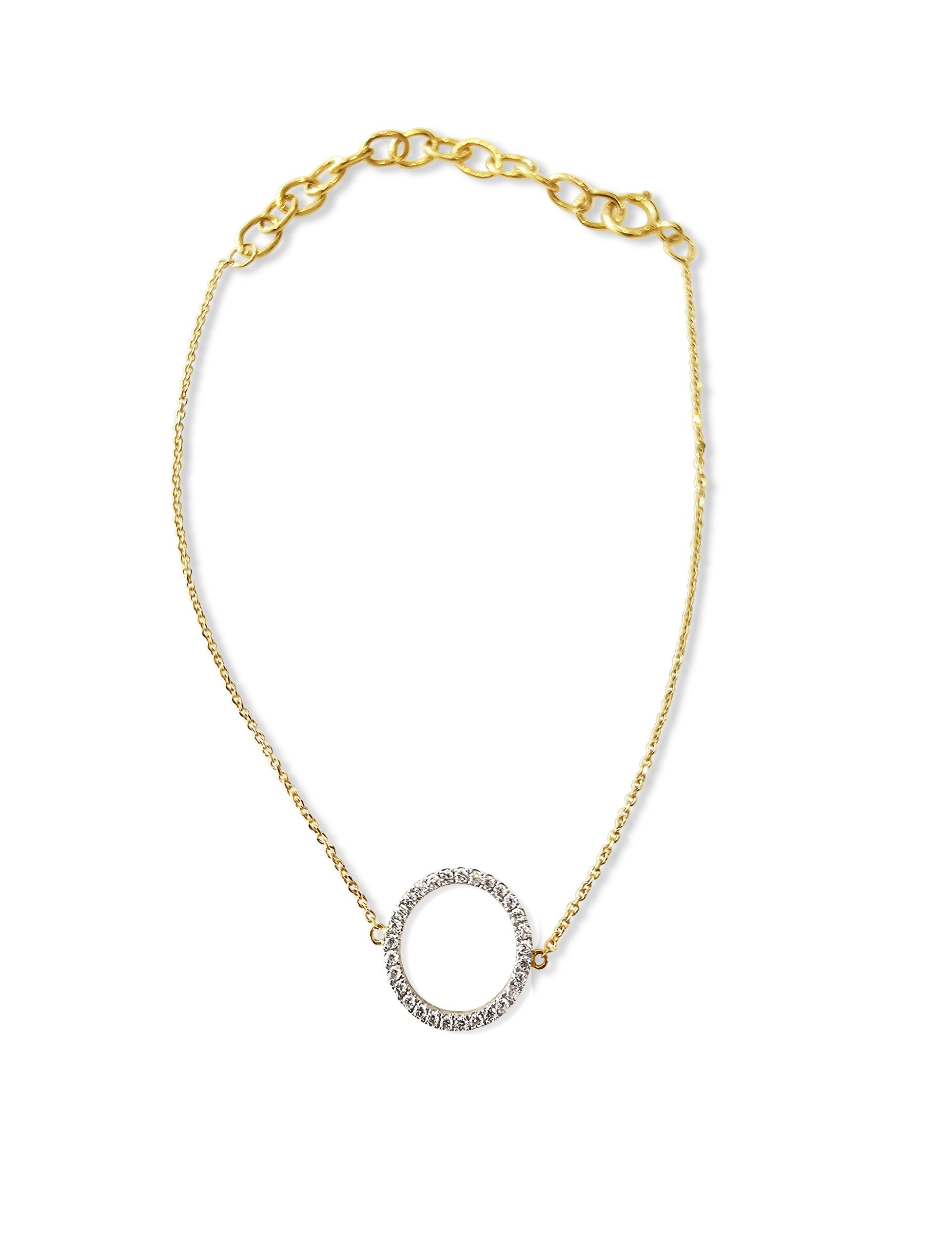 Add a touch of luxury to your look with this beautiful, delicate 18K gold bracelet. The sleek design is accentuated by a circle in the center, set entirely with sparkling diamonds that make your wrist shine. Whether you're elevating a casual outfit or completing an evening look, this bracelet is the perfect statement piece. Timeless, yet with a modern twist – the ideal piece for any occasion.