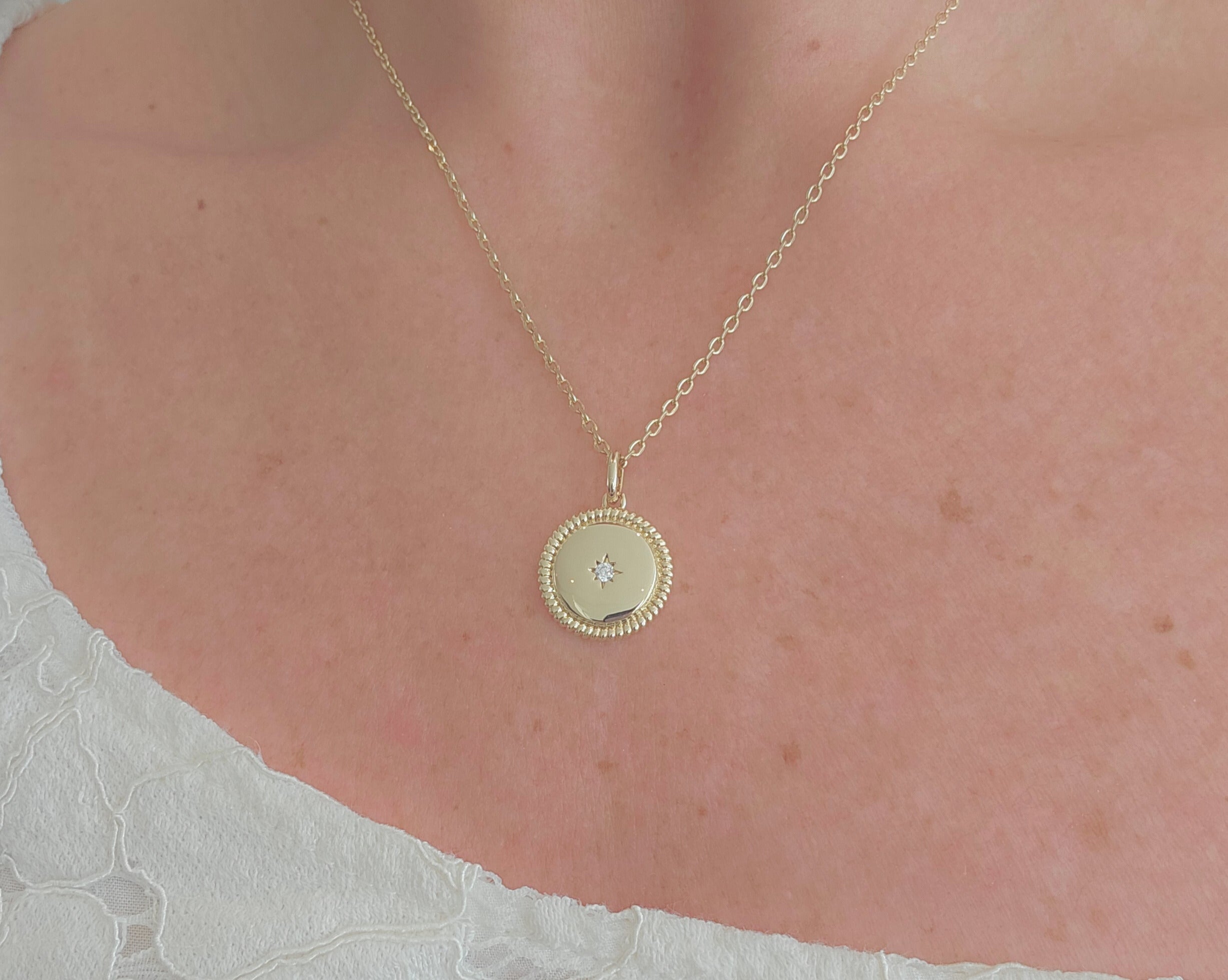 The "Evara" necklace features a delicate medallion shape. A clear cubic zirconia shines at its center, set in a star-shaped motif reminiscent of the strength and beauty of a sunbeam. This refined design is crafted from high-quality 18-karat gold plating, ensuring a luxurious look and lasting shine.