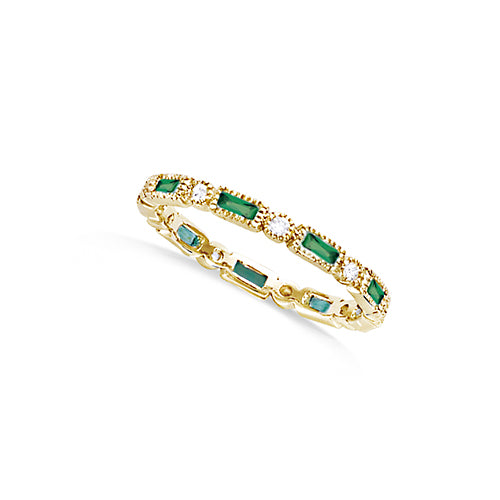 Give your style a fresh, luxurious touch with this beautifully delicate ring. It features elongated green stones set alternately with round, sparkling cubic zirconia. The combination of the vibrant green color and the dazzling cubic zirconia creates a refined and unique look. Perfect for those who appreciate a piece of jewelry that exudes class and character.
