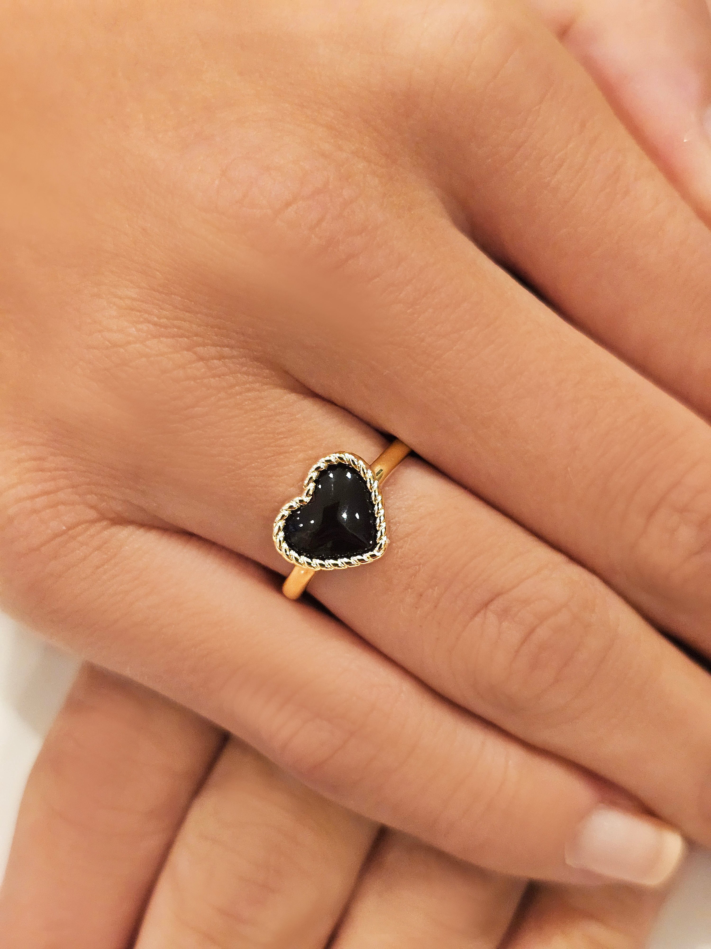 This ring features a deep black stone in the shape of a heart, wrapped in a subtle gold thread that accentuates its elegant beauty. The 18K gold-plated design adds a luxurious, timeless look, while the dark stone lends a mysterious, bold charm. Perfect for a sophisticated yet striking look.