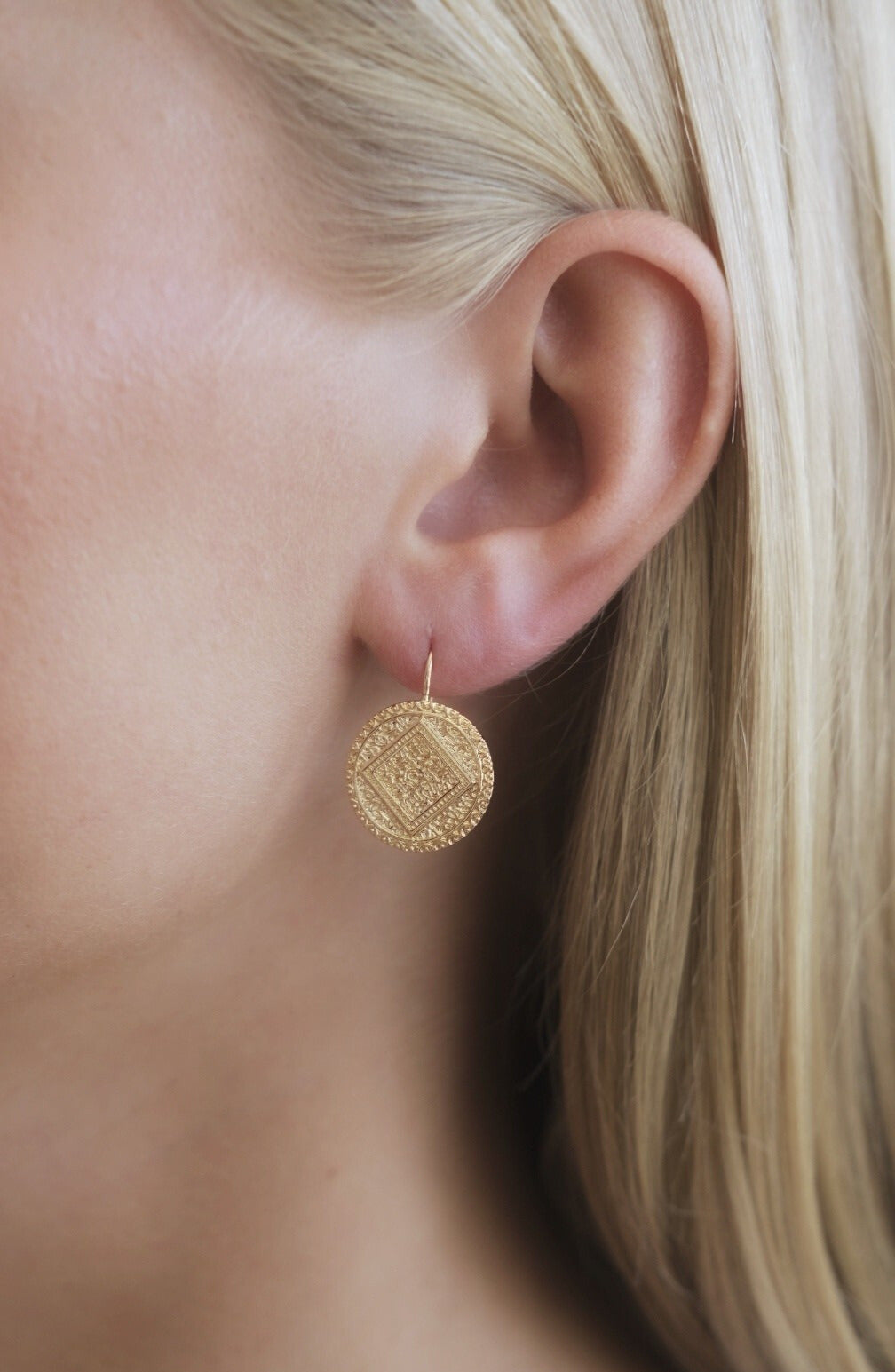 The Grace earrings are inspired by the classical beauty of ancient Greece, featuring a matte gold oval pendant with a delicate diamond-shaped engraving at the center. The design evokes a sense of timeless elegance. Crafted from matte 18K gold, this pendant exudes a refined luxury that feels both modern and classic. These earrings are perfect for women seeking an elegant and unique piece with a vintage flair. Gift idea: the perfect gift for a bride-to-be.