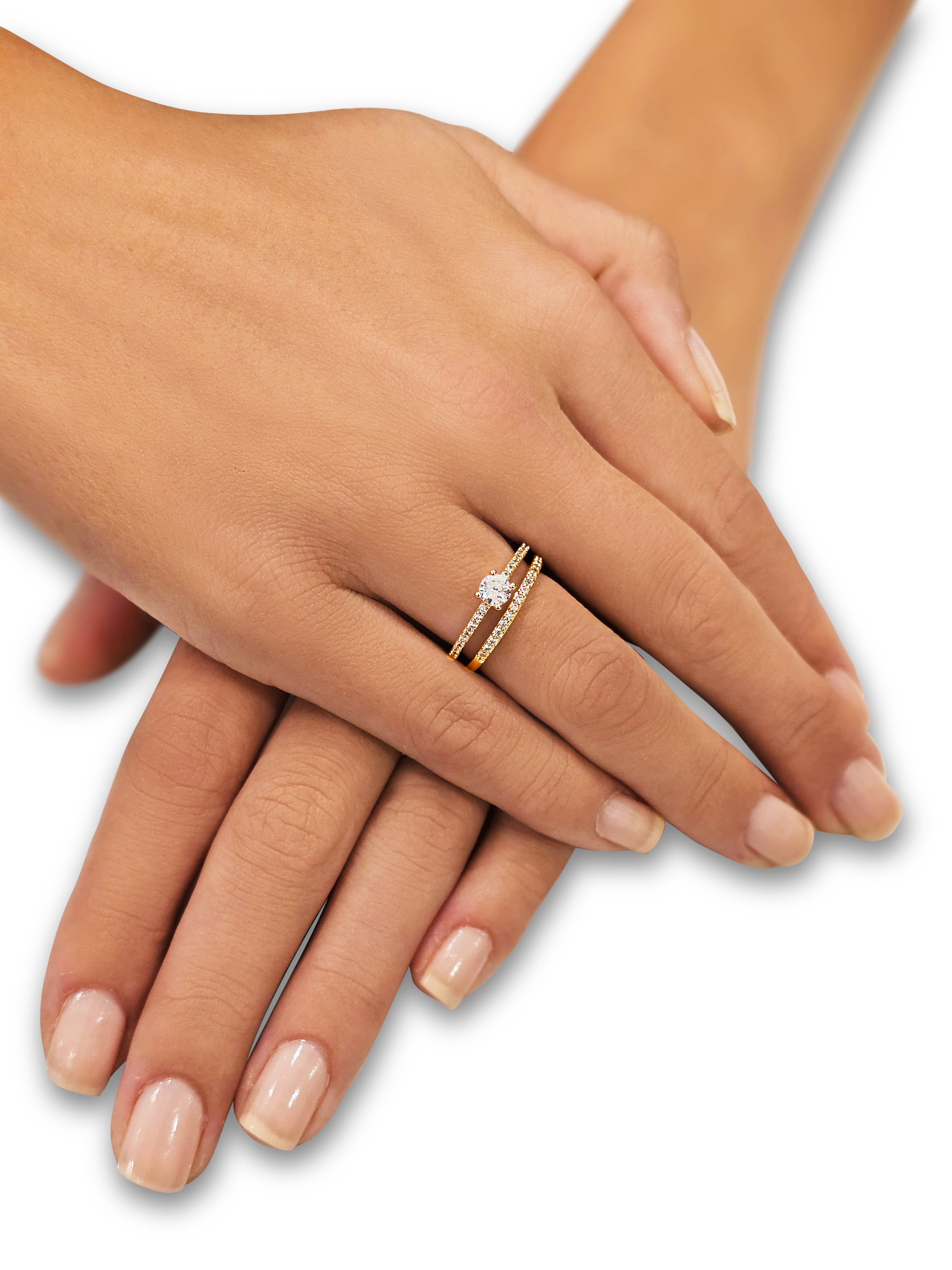 Twice the sparkle in one set. This "Regalia" ring set features two beautiful rings that complement each other perfectly. The first ring features an elegant row of stones with a larger, sparkling center stone as the focal point. The second ring is a delicate band filled with sparkling stones that together create a radiant look. Wear them together for a glamorous statement, or separately for a subtle touch. This set offers endless combinations and glamour in one.