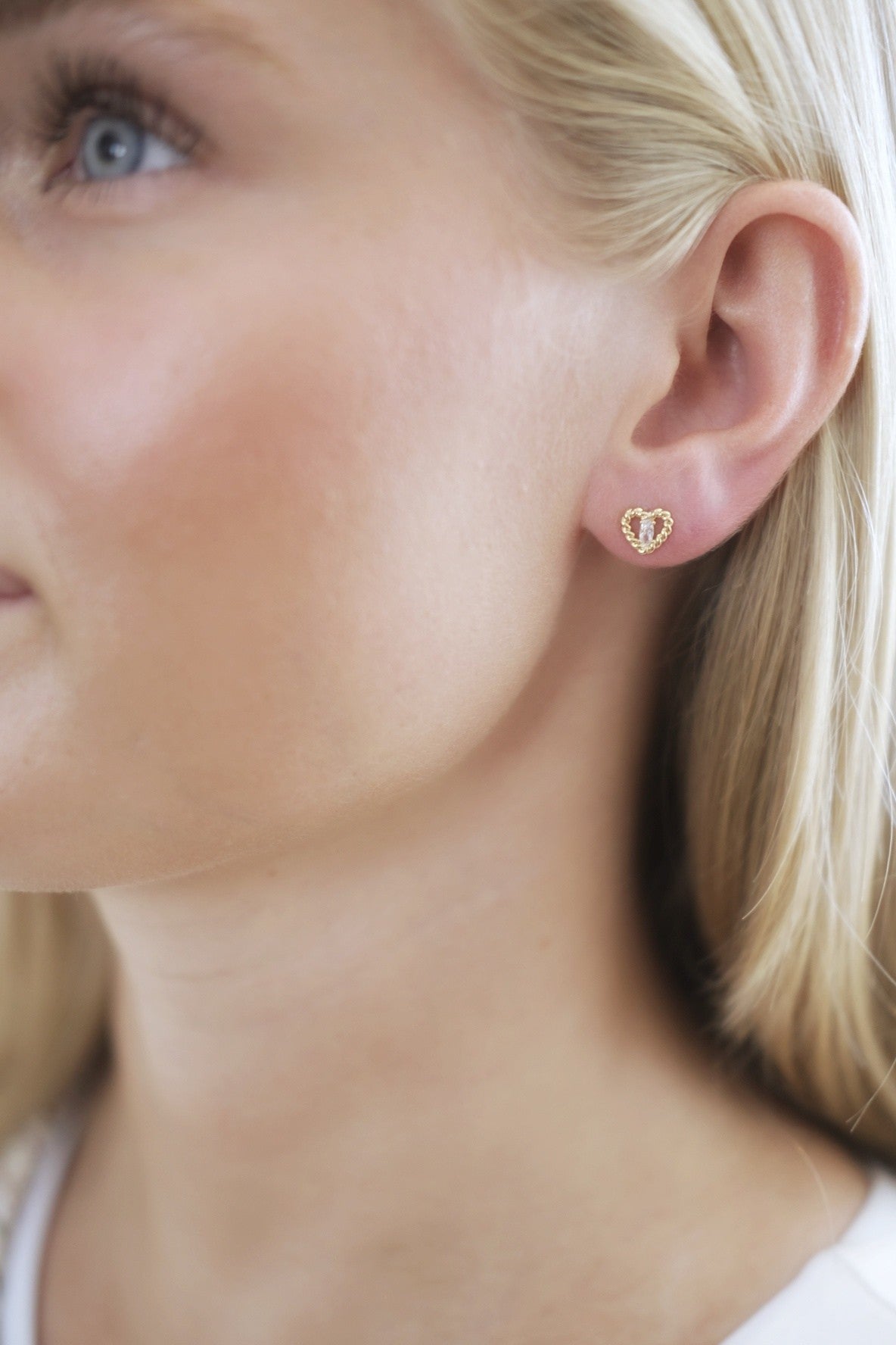 The small "Tress" earrings feature a heart-shaped design with a graceful, twisted gold edge. A vertical cubic zirconia stone sparkles in the center. Crafted from high-quality 18-karat gold plate, they are hypoallergenic and designed for everyday wear or to surprise your loved one with this beautiful gift.