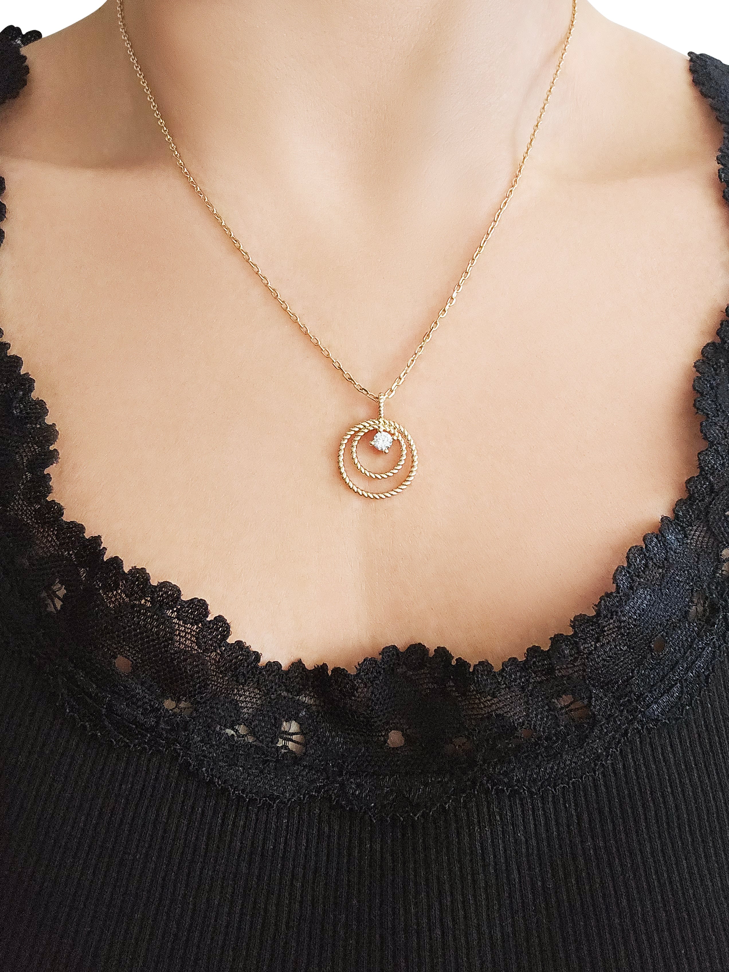 The Triad Pendant features a minimalist design with two elegant circles and a sparkling stone in the center, making it perfect for any occasion. Its subtle design creates a refined look that can be worn solo or paired with other necklaces for a trendy, layered style. This pendant effortlessly complements both casual and chic outfits, making it a versatile choice for any fashion-conscious woman.