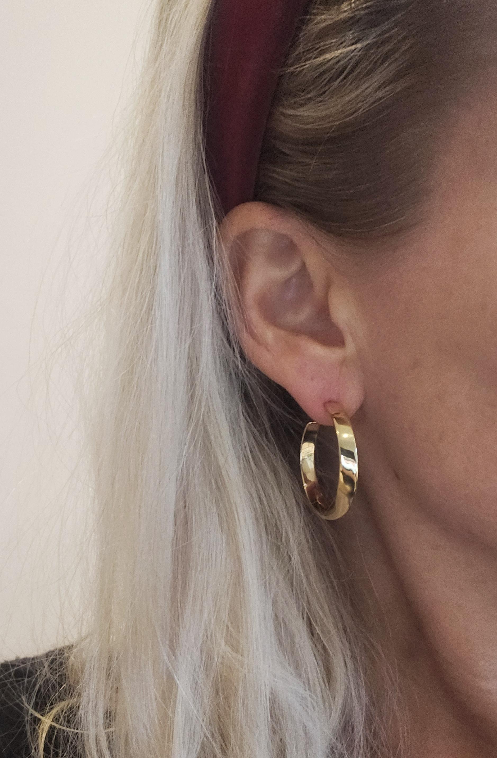 Laat jouw look stralen met de Aveline oorbellen/hoops maat S – een perfecte balans tussen elegantie en moderne klasse. Deze prachtige, goudkleurige dikkere oorringen hebben een golvende vorm die subtiel het licht vangt en elke outfit een luxueuze uitstraling geeft.