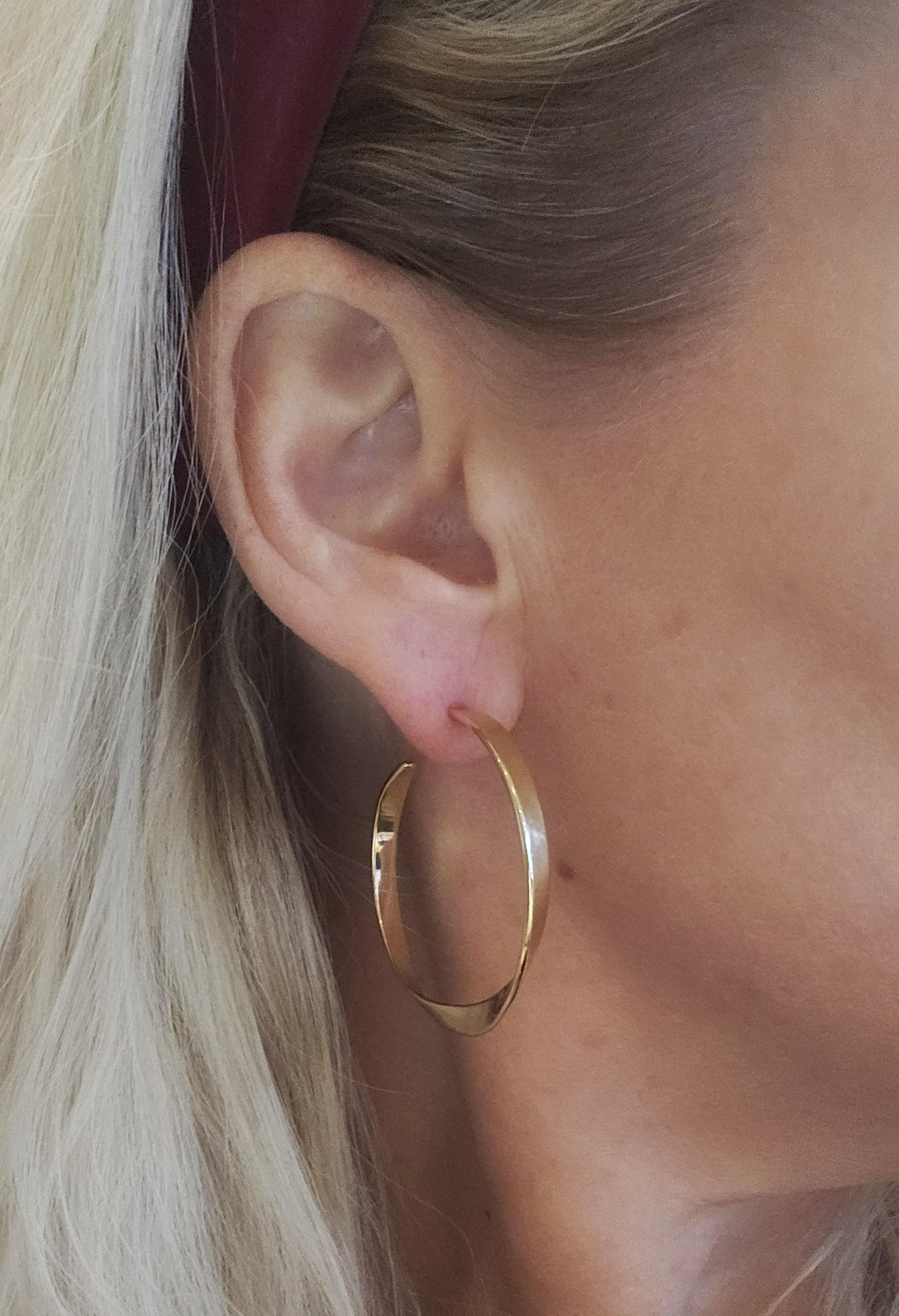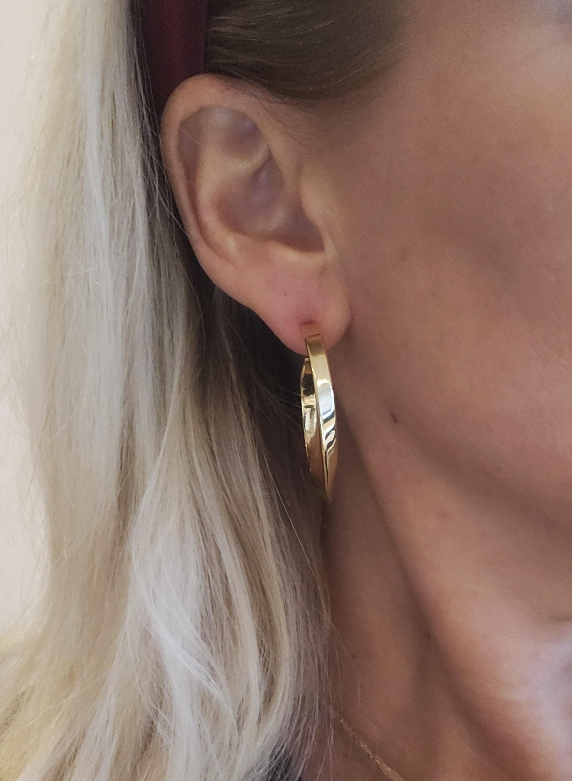Laat jouw look stralen met de Aveline oorbellen/hoops maat M – een perfecte balans tussen elegantie en moderne klasse. Deze prachtige, goudkleurige dikkere oorringen hebben een golvende vorm die subtiel het licht vangt en elke outfit een luxueuze uitstraling geeft.